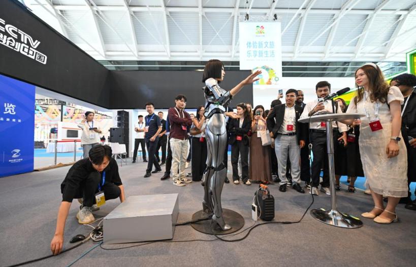 会展搭建师在天津举办的中国文化旅游产业展览会现场钦慕AI机器东谈主互动斥地(9月13日摄)。新华社记者 孙凡越 摄