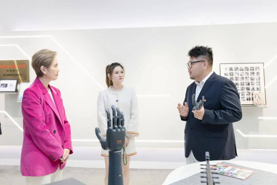 BrainCo强脑科技创举东说念主兼CEO韩璧丞(左一)、结伴东说念主兼高档副总裁何熙昱锦(右一)为杨莉明(居中)先容公司