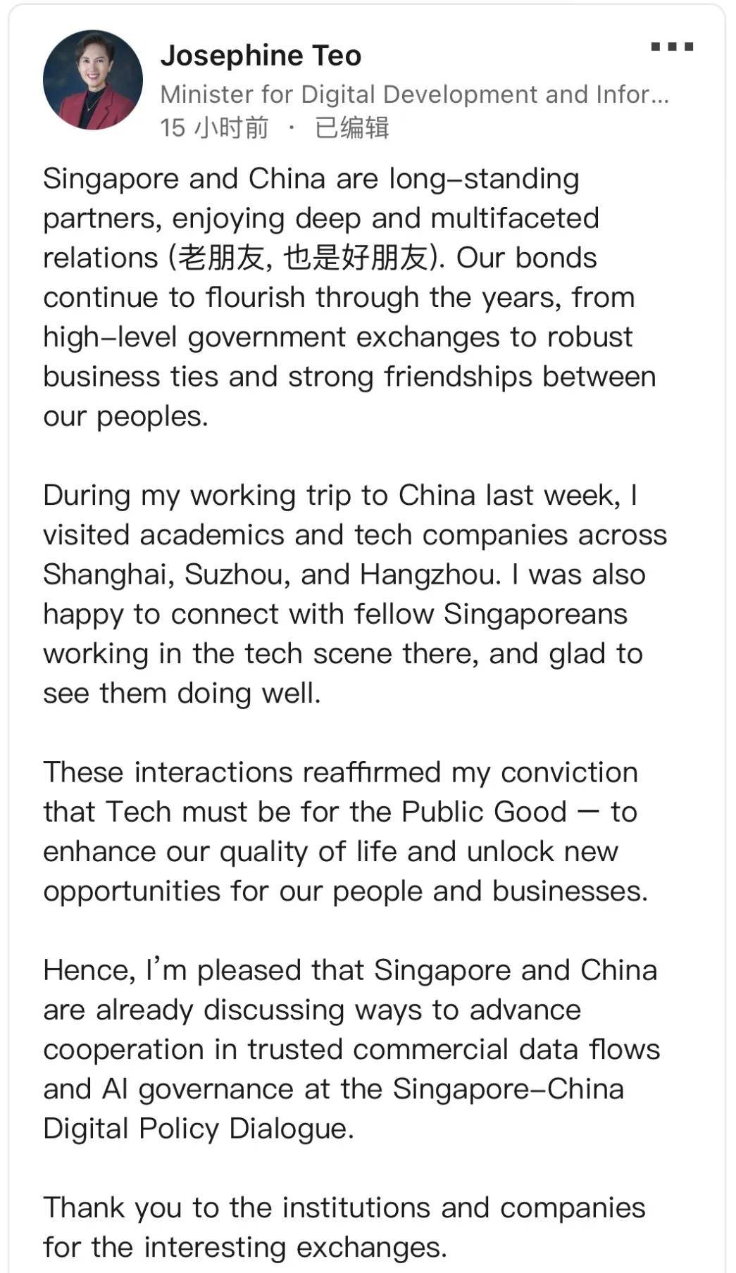 上周在中国出差时代,我参不雅了上海、苏州和杭州的学术机构和科技公司。我也很沸腾能与在科技范围处事的新加坡东说念主成立考虑,看到他们得回邃密的发展,我感到超过欣慰。